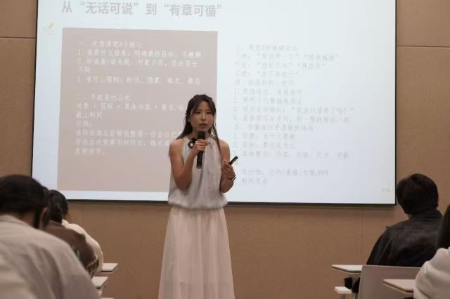 针对以上问题,她给出针对性改进建议:正视内心焦虑,接纳自身不足,学会借助他人鼓励调整心态,明白怯场是普遍现象,以正向心理暗示建立自信;坚持刻意练习,借鉴脱口秀、主持赛事等优质表达范本,学习从容舒展的表达节奏;弱化外界评价带来的内耗,重视每一次实践复盘,总结经验、补齐短板,实现稳步提升。同时,她分享多项临场表达技巧:登台紧张时,可通过深呼吸、丹田发声、放缓语速、梳理逻辑快速稳住状态;日常沟通与发言中,依托“对象+目标+内容+要求+时限”梳理思路,运用PREP表达模板,以“观点+论据+案例+总结”搭建逻辑框架,让语言表达条理清晰、简洁高效。整套方法兼具科学性与实操性,切实帮助同学们掌握缓解紧张的办法,练就从容表达的综合能力。