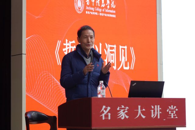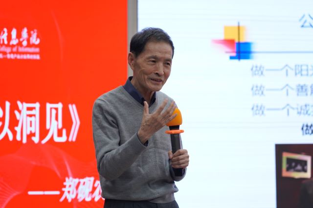 24日晚19:00,图书馆小礼堂熙熙攘攘,一场由郑砚农老师主讲的以《哲思以洞见》为主题的跨越学科边界、融合理论与实践的思想盛宴正在进行。讲座初始,郑老师以谦逊姿态开篇,以“年长同学”的亲切姿态与师生进行对话交流。结合参观校园的感受,他巧妙指出信息时代无边界,学科融合是必然,一语道破信息化时代下,任何领域都与信息紧密相连的真谛。
